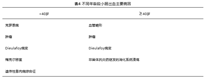 小肠出血占消化道出血的5%~10%,导致小肠出血的病变类型与年龄相关。毛细血管扩张和非甾体抗炎药继发小肠溃疡在40岁及以上的患者更为常见;年龄低于40岁者以克罗恩病和梅克尔憩室为主要病因(表4);而小肠肿瘤(如胃肠道间质瘤、淋巴瘤、类癌、腺癌或其他息肉样病变)和Dieulafoy病变在年轻和年老人群中发病率相当。就全年龄段小肠出血病因而言,血管畸形最为常见,日本学者Yano?Yamamoto根据小肠血管病变的内镜下表现将其分为4类:①静脉/毛细血管病变伴或不伴渗血(type 1a直径小于1 mm的点状红斑、type 1b 斑片状红斑);②动脉病变(type 2a 直径小于1 mm非隆起型动脉畸形伴搏动性出血、type 2b搏动性红色隆起,周边无扩张静脉);③动静脉畸形(type 3周边伴有扩张静脉的搏动性红色隆起);④无法归入前述3类的病变(type 4)。该分类有助于内镜下治疗方法的选择和预测治疗后再发出血风险,是目前较为实用的分类方法。此外,门静脉高压导致的小肠异位静脉曲张及黏膜出血倾向是小肠出血的少见病因;其他引起小肠出血的罕见原因包括遗传性息肉病综合征、与获得性免疫缺陷综合征相关的卡波西肉瘤、普卢默-文森综合征、弹性纤维假黄瘤、埃勒斯-当洛综合征、过敏性紫癜、神经纤维瘤病和恶性萎缩性丘疹病等。