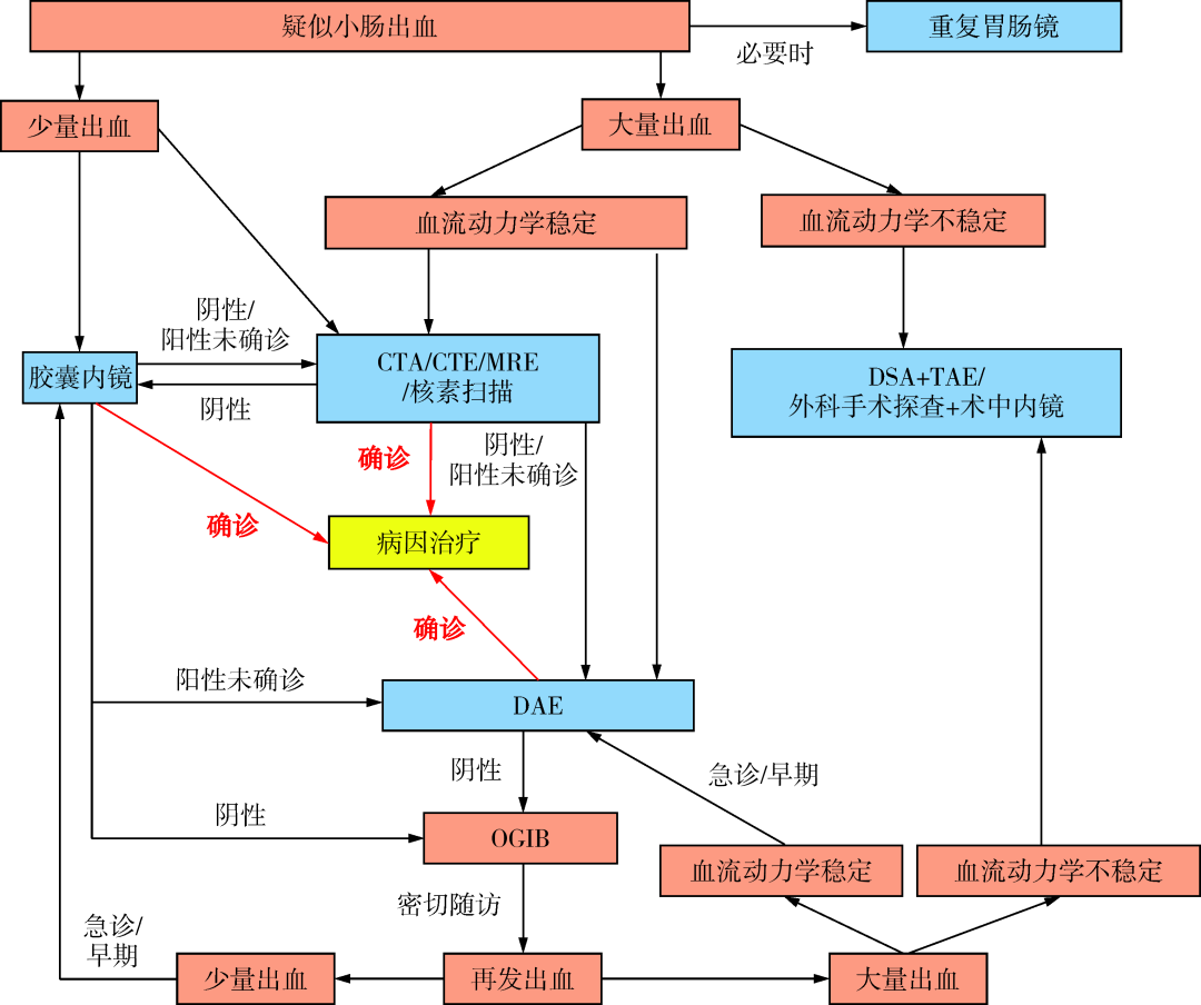 注:CTA指CT血管成像;CTE指CT小肠成像;MRE指磁共振小肠成像;DSA指数字减影血管造影;TAE指经动脉栓塞止血;DAE指器械辅助式小肠镜;OGIB指不明原因消化道出血