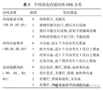 Goligher 分级目前为国内外应用最为广泛的内痔分度体系,根据脱垂程度将内痔划分为Ⅰ-Ⅳ 度(表1)[19]。令狐恩强教授提出的基于内镜所见的 LDRF 分类[21],进一步从内镜下痔核直径及相关危险因素进行描述,为内镜微创治疗的术式选择与操作决策提供了实用参考(表2)。2025版《消化内镜内痔微创治疗专家共识》[21]依据内痔脱垂程度、出血频率和内痔表面黏膜的危险因素,制定了中国消化内镜内痔PBR分类法(表3),该分类法可为内镜下内痔微创治疗方案的制定提供理论依据。临床实践中,通常根据内痔分度制订个体化治疗方案[4,21-22]。近年亦有 PATE2006[4,23]与SPHC[24]等新型分级体系问世,但由于结构相对复杂,尚未在临床获得广泛推广与应用。