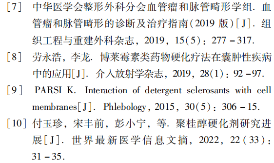 硬化药物的作用机制在于,硬化药物可能破坏淋巴管内皮细胞,使淋巴管纤维化,实现治疗目的。常用药物有博莱霉素和无水乙醇等。博来霉素具有潜在致肺纤维化风险[8],而无水乙醇作用强烈,有引发血管栓塞或者组织坏死的风险[3]。