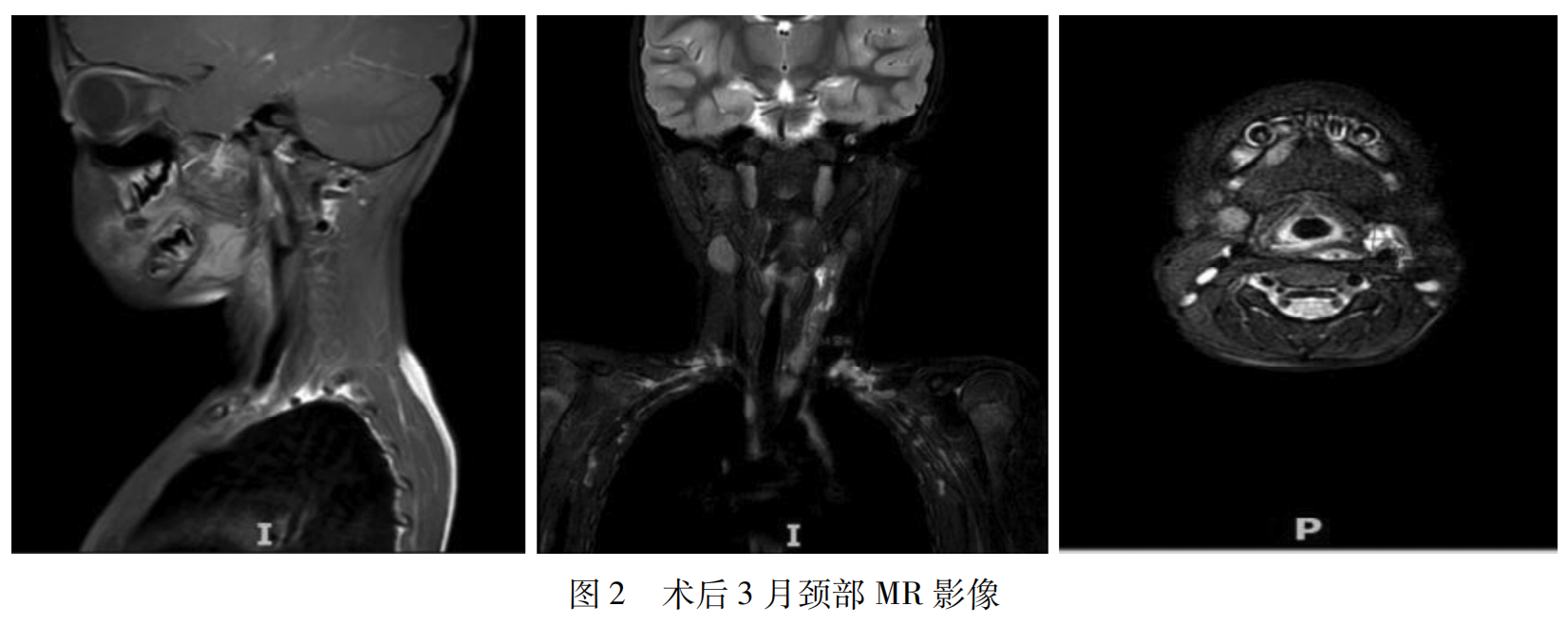 术后 3个月复查,视诊左侧颈部无明显肿块,体格检查左侧颈部肿块体积较前明显减小。颈部核磁共振检查,见图 2,左侧囊状异常信号范围较治疗前明显减小,大小约 34.34mm×10.12mm×10.40mm,体积较治疗前减小约 75.63%,治疗效果明显。