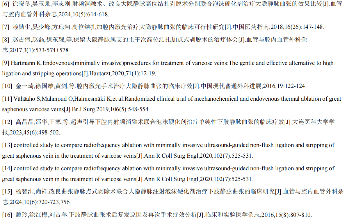 综上所述,大隐静脉高位结扎联合腔内激光治疗及聚桂醇泡沫硬化剂注射的综合疗法,在治疗 C3、C4 级下肢静脉曲张中展现出微创性、安全性及高效性,具有良好的临床应用价值。随着医疗技术的持续发展,未来可针对下肢静脉曲张的治疗方案将更加安全与精准,从而提升患者的生活质量。