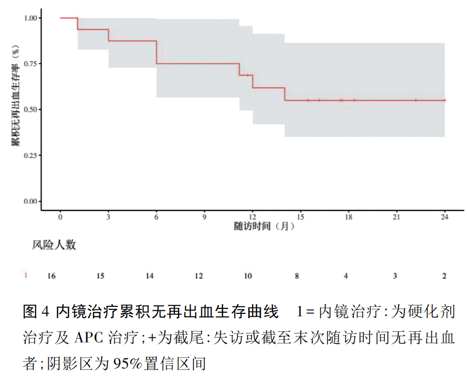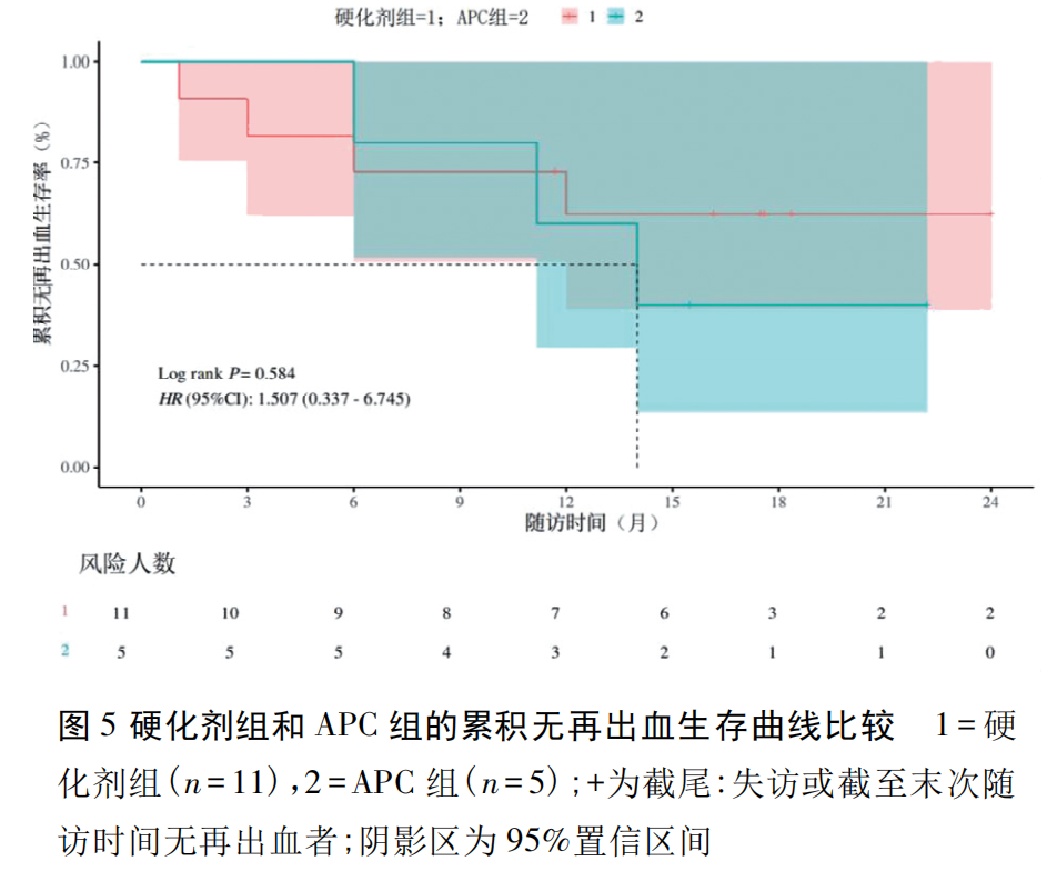 本研究使用 Kaplan-Meier 法对 16 例患者进行生存分析,终点事件定义为再出血,其中 3、6、12、18 个月累积无再出血生存率分别为 87.5%、75.0%、61.9%、55.0%,且 14 个月后无新增终点事件( 图 4) 。同时对硬化剂组与 APC 组进行生存分析分组比较,3、6、12、18 个月累积无再出血生存率分别为 81.8%vs 100%、72.7%vs 80%、62.3%vs 60%、62.3%vs 40%,尽管受限于样本量小,差异无统计学意义( P>0.05) ,但硬化剂组 12 个月后未发生终点事件,而 APC 组仍有再出血事件发生,显示出硬化剂治疗或可改善长期止血稳定性( 图5) 。