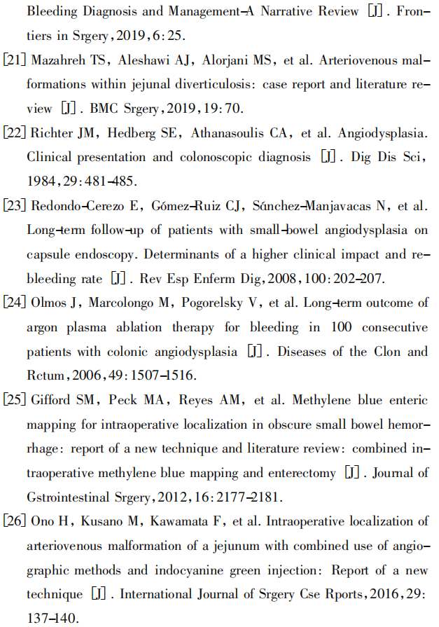 本研究患者以中老年人为主,多表现为黑便、贫血,部分病灶即便通过 CT 血管成像( CTA) 也未能检出; 但由于大多数小肠 AVM 为先天性病变,对于年轻患者也需格外谨慎,目前,BAE 在 AVM 的诊断中价值逐步显现,已被推荐用于相关检查[21~ 23]。因为 CT 小肠造影在检出率方面表现较好,也被推荐作为小肠 AVM 的有效影像学检测手段[24]。此外,考虑到可能存在多发病灶,有必要进行动态增强 CT 检查,有报道称,5% ~ 37%接受 AVM 切除术的患者会再次出血,其中一个原因是切除不完全[1,25,26]。当出现大量消化道出血或病变位于小肠的情况下,选择性血管造影或放射性核素红细胞标记扫描( 闪烁扫描法) 可检测到这些病变[12],但目前尚没有一种诊断方法的灵敏度能达到 100%;不过,在手术切除的情况下,病理检查仍然是确诊的金标准[21,27~ 29]。