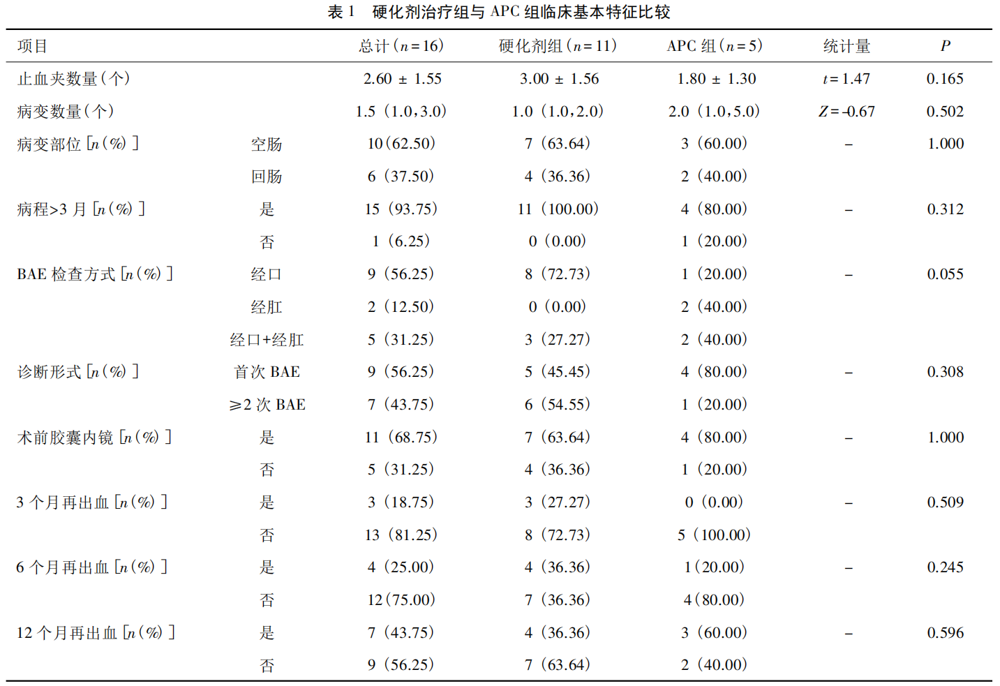 结论:BAE 下实施内镜治疗在空肠和回肠 AVM 所致小肠出血患者中具有良好的止血效果及较低的再出血风险; 硬化剂联合止血夹与 APC 联合止血夹均为安全、可行的内镜治疗手段,两者短期疗效相近,但内镜下硬化剂治疗在远期疗效方面可能具有一定优势。