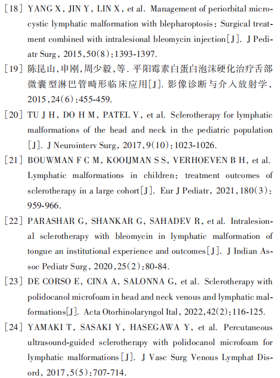 目前硬化治疗常用的硬化剂有博来霉素、聚桂醇、无水乙醇、多西环素、沙培林等,而临床上对于硬化剂的选择尚无统一定论,其疗效各不相同[20-21]。博来霉素最初是一种抗肿瘤药物,现被用于淋巴管畸形的硬化治疗,其注入囊腔后通过诱导淋巴细胞产生非特异性炎症反应,促进成纤维细胞增殖,抑制淋巴内皮细胞生长,导致囊腔纤维化和收缩。常见不良反应有发热、胃肠道症状等,极少出现血尿、过敏性休克[22]。BOUWMAN 等[21]研究表明,116 例淋巴管畸形患儿经博来霉素联合聚桂醇治疗,临床有效率为 97%,而单一使用博来霉素治疗的临床有效率为93%,相较于单一疗法,联合用药疗效更好。聚桂醇作为一种表面活性剂类硬化剂,具有良好的起泡性能,因此在泡沫硬化治疗中发挥着重要作用。当聚桂醇被注入淋巴管畸形的囊腔内后,会形成微小泡沫,这些泡沫能够在囊腔内均匀分布,可以暂时阻断囊腔内血流,使得药物在局部保持相对稳定的浓度,避免液体硬化剂被快速流动的血液稀释。同时,泡沫的存在大大增加了药物与囊腔内壁的接触面积,延长了药物的作用时间,从而提高了治疗效果[23]。聚桂醇最初是作为麻醉药物应用于临床的,随着对其药理作用研究不断深入,学者们发现,聚桂醇在治疗各类脉管畸形方面具有显著效果。临床实践证明,聚桂醇用于淋巴管畸形硬化治疗是安全有效的。在缓解患儿术后疼痛程度方面,聚桂醇表现出色,与其他硬化剂相比,它能减轻患儿治疗后的疼痛。此外,聚桂醇很少产生过敏或炎症反应,这一特性使得它更易于被患儿家属接受[24]。有学者使用聚桂醇泡沫硬化剂联合平阳霉素治疗舌静脉畸形,经治疗后,26 例患儿的舌静脉畸形瘤体明显缩小,症状明显改善,术后未出现严重并发症[25]。本研究共纳入患儿24例,均采用超声引导下博来霉素联合聚桂醇经皮硬化治疗,术后随访 3 ~ 12个月,除 1例微囊型淋巴管畸形效果欠佳外,其余23例治疗效果均较好,术后无明显并发症发生。