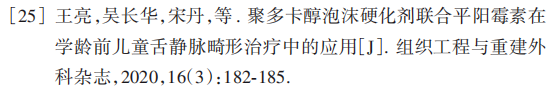 综上所述,超声引导下博来霉素联合聚桂醇经皮硬化治疗儿童淋巴管畸形不仅减少了博来霉素的使用剂量,降低肺毒性的发生风险,还增强了硬化治疗效果,优化治疗方案的选择,值得临床推广应用。然而,本研究样本量较少,随访时间较短,为获取更具广泛代表性与可靠性的结论,证实本治疗方案的有效性和安全性,仍需纳入更大规模、多中心的样本开展深入研究,并延长随访时间,以便为淋巴管畸形的精准诊疗提供更多依据。
