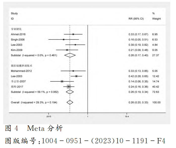 本研究的局限性包括:(1)目前关于腹腔镜肾囊肿去顶术和穿刺抽吸硬化术的研究较少,且纳入研究中无 RCT;(2)各研究未采用统一的纳入、排除标准和统一的疗效判定指标;(3)尽管采取了广泛的检索,但仍无法排除潜在的发表偏倚;(4)不同研究间术者不同,术者的熟练程度对研究结果会有一定的影响;(5)本 Meta分析涉及多个中心的研究,不同中心对穿刺抽吸硬化剂的选择不同和腹腔镜手术(剥脱术或去顶术)不同,以及术后患者的护理等方面达不到统一的标准,因此可能存在实施偏倚。所以还需更多、更详细的数据来证实本次研究的结论。