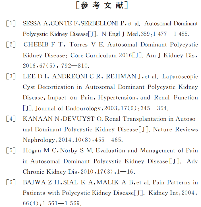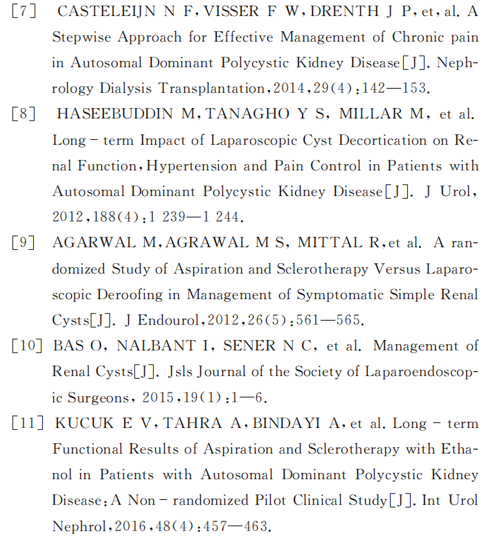 对于疼痛的控制:疼痛常为囊肿出血、感染或结石所致,治疗应针对病因[26]。止痛方式包括药物、非药物和非侵入性的方式,也可能需要多学科(影像、泌尿、疼痛和理疗)合作[26]。推荐根据肾功能水平依照世界卫生组织止痛阶梯进行序贯药物治疗[27]。手术治疗包括肾囊肿穿刺硬化术、腹腔镜肾囊肿去顶术或肾切除,需要根据囊肿的大小、位置和数量选用。对于单个囊肿直径>5cm或3个以上直径>4cm的囊肿诊断性囊肿穿刺减压后观察疼痛是否有效缓解,再决定是否需要进一步囊肿穿刺硬化术或腹腔镜囊肿去顶术[26]。通过穿刺硬化术,KUCUK et al发现平均疼痛评分(Visual analogscore,VAS)在术后第6个月、12个月以及在术后10年都下降[1];LEEetal发现术后1年疼痛缓解率达64%[3];KIM et al报道了在治疗后随访的54个月期间,疼痛缓解率达76%[I4];SINGH et al发现多次对显性囊肿采用穿刺硬化术可以有效缓解疼痛[2]。通过腹腔镜肾囊肿去顶术,在既往最长10年的随访研究中发现,疼痛的缓解率为62%~81%[8]。