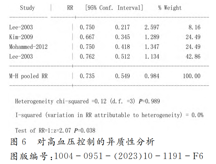 2.3.2 术后对高血压的控制?(1)异质性分析。模型经过整合,I2=0<50%,与50%比较,明显较小,说明各个文献间异质性较低,文献结论相对一致。同时经过一致性检验,χ2?=0.12,P =0.989>0.1%,说明所有文献异质性较低。通过图 6 可以看出,所 纳入的文献的高血压RR值(术后发生率与术前发生率之比)均小于1,最低为0.667。最终经过整合,RR 值为0.735,可信区间为0.549~0.984,与1相比,差异具有统计学意义(Z=2.07,P=0.038),说明整合效应值明显小于1,即表明术后高血压的发生率是术前的0.735倍,说明术后的高血压发生率明显降低了。