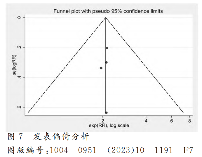 (2)发表偏倚分析。从图7的漏斗图来看,所有文献均在漏斗图内,说明纳入的文献不存在明显的发表偏倚。