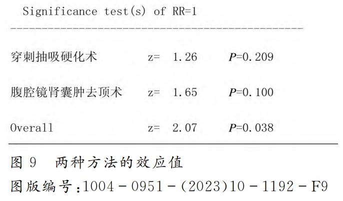 (3)Meta分析。以手术方法为亚组,穿刺抽吸硬化组的 RR 值为0.69,腹腔镜肾囊肿去顶术 RR为0.76,两种方法的可信区间均包括1,进一步进行统计学分析,发现两组的各自 RR 值与1相比较差异没有统计学意义(见图8),均接近1,也说明了两种方法的效应值相差不大,两组的高血压发生率相似。其中腹腔镜肾囊肿去顶术 RR 值经过检验,P=0.100,接近0.05,需要进一步增加文献数据以确定结论(见图9)。