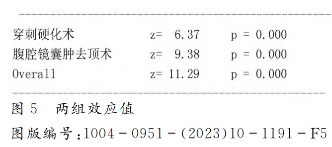 (3)Meta分析。通过对腹腔镜肾囊肿去顶术和穿刺硬化术进行分组分析,发现腹腔镜肾囊肿去顶术组的RR值为0.26,穿刺硬化组的RR值为0.26,两者效应值相近,差异无统计学意义(见图4)。进一步对两组的效应值进行分析,发现两组各自的 RR值差异有统计学意义,即腹腔镜肾囊肿去顶术组和穿刺抽吸硬化术组术后的疼痛明显降低(见图5)。
