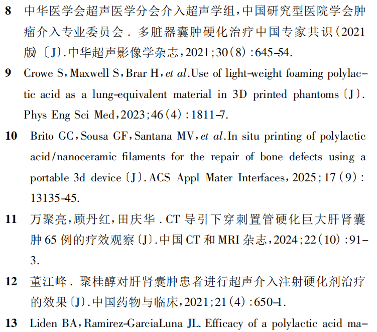 治疗前进行血常规、尿常规等检查,确保可耐受硬化治疗。采用彩色多普勒超声诊断仪( 西门子 sequoia sliver) ,依据囊肿大小,估测囊液量,评估安全穿刺路径,并确定穿刺点。患者取仰卧位或侧卧位,在超声诊断仪引导下,采用 PTC 穿刺针或引流管置入囊腔,抽出囊液后注入聚桂醇( 规格 10 ml ∶100 mg,陕西天宇制药有限公司,生产批号 20211107) ,囊腔内保留聚桂醇,或用聚桂醇冲洗囊腔 20 min 后抽出残液,术后按压穿刺部位 1 min,并加压包扎。