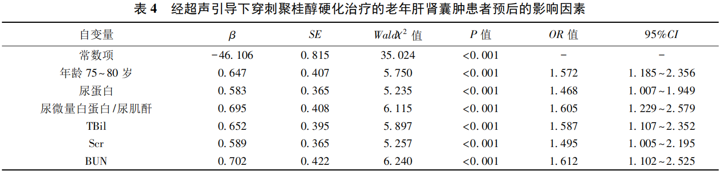 多因素 Logistic 回归分析结果显示,年龄 75 ~ 80 岁、尿蛋白、尿微量白蛋白/尿肌酐、TBil、Scr、BUN 是经超声引导下穿刺聚桂醇硬化治疗老年肝肾囊肿患者预后的影响因素( P<0. 001) 。见表 4。