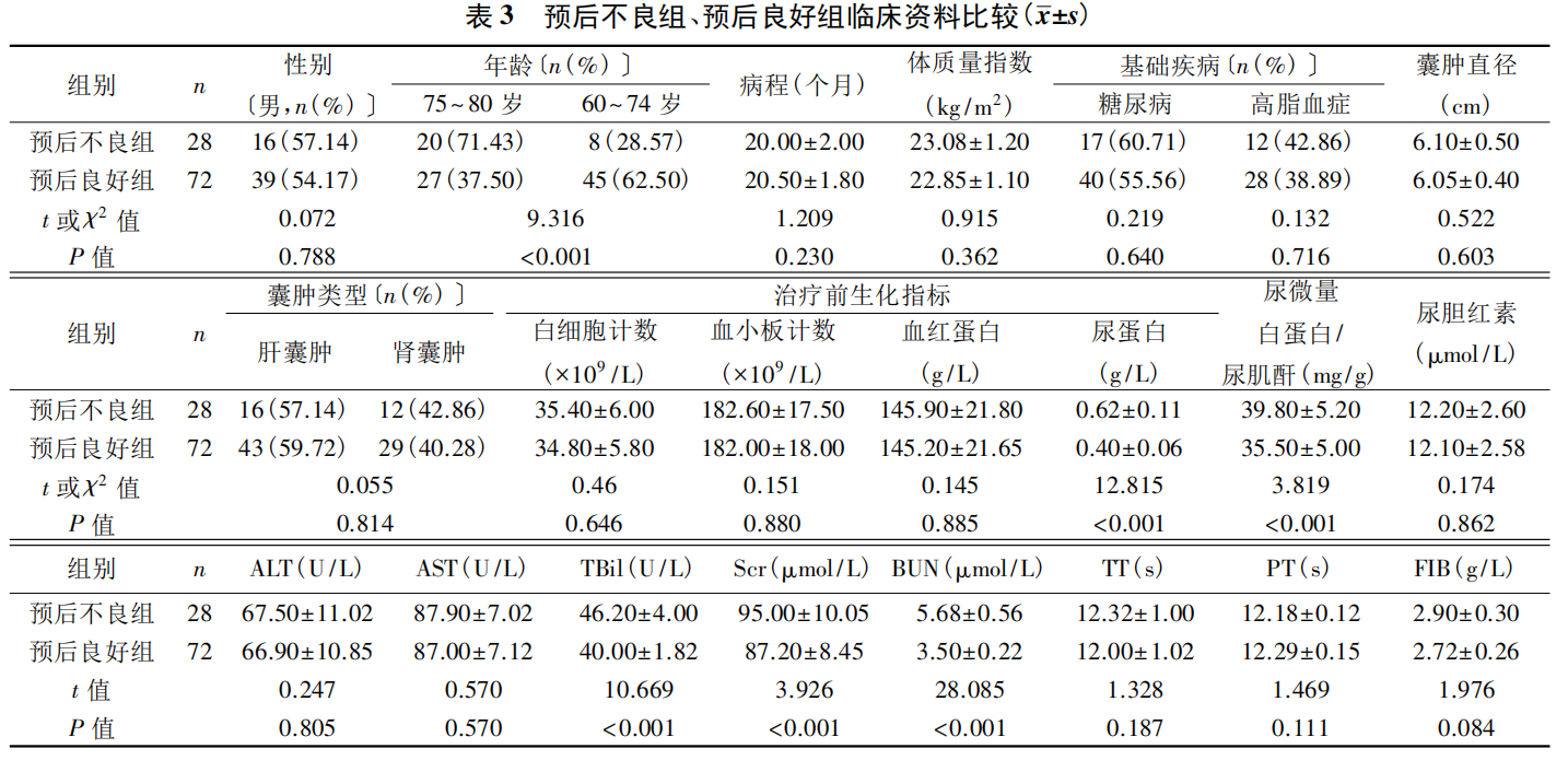 ①比较治疗前、治疗后 1 w 血常规( 白细胞计数、血小板计数、血红蛋白) 、尿常规( 尿蛋白、尿微量白蛋白/尿肌酐、尿胆红素) 、肝肾功能〔丙氨酸氨基转移酶( ALT) 、天门冬氨酸氨基转移酶( AST) 、总胆红素( TBil) 、血肌酐( Scr) 、血尿素氮( BUN) 〕、凝血功能〔凝血酶时间( TT) 、凝血酶原时间( PT) 、纤维蛋白原( FIB) 〕指标水平变化。②治疗后 3 个月评估临床疗效,治愈: 囊肿直径<0.5 cm或消失; 有效: 囊肿体积较治疗前减小>33. 33%; 显效: 囊肿体积较治疗前减小≤33. 33%; 无效: 囊肿体积较治疗前无明显变化,甚至增大。有效率 = 治愈率+有效率。③比较预后不良组、预后良好组临床资料。④筛选经超声引导下穿刺聚桂醇硬化治疗的老年肝肾囊肿患者预后影响因素。