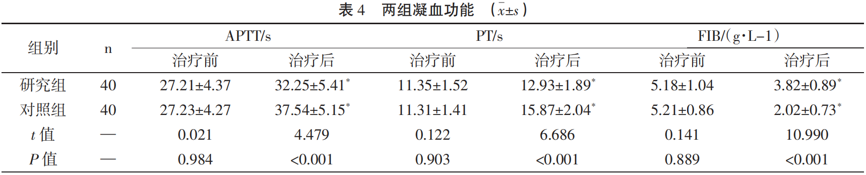 术后,联合组患者的 APTT、PT指标低于对照组,而 FIB 指标则高于对照组(P<0.05),见表 4。