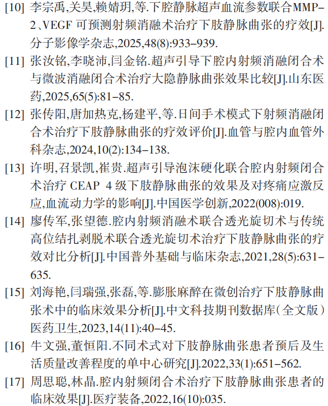 结论:将超声引导下射频闭合术与硬化剂注射相结合,构成了一种治疗下肢静脉曲张的综合治疗方案,其在减少创伤、加速康复及改善生理功能方面展现出显著的临床优势。