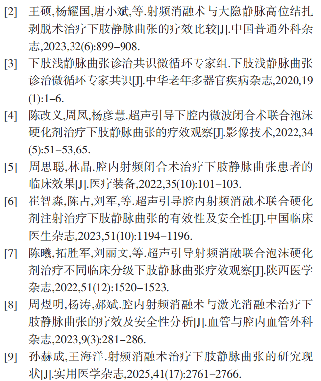 腔内射频治疗与传统的静脉剥脱术相比,手术切口小,创伤小,恢复快,术后并发症少。 术中医生可借助超声实时监测, 确保射频能量准确作用于静脉壁,避免对周围组织的损伤。 该疗法能有效闭塞病变静脉,缓解疼痛、水肿、皮肤色素沉着等症状。 术后患者疼痛较轻,可早期下床活动,有助于促进下肢血液循环,降低深静脉血栓形成风险。 硬化剂作为可引起血管内皮细胞损伤、变性乃至坏死的化学物质,注入静脉后能激发无菌性炎症,促使静脉壁粘连、闭合并最终纤维化,消除曲张静脉[6]。联合治疗能同时处理主干与细小分支静脉,提升治疗的彻底性,有效改善腿部疼痛、肿胀、沉重感、皮肤瘙痒及色素沉着等症状,提高患者生活质量。传统手术因需作腹股沟切口并进行大范围的静脉剥脱, 对皮下组织和皮神经的牵拉、损伤在所难免,导致术后疼痛较为明显。相比之下,联合微创方案仅通过穿刺点进行操作,避免了肌肉、筋膜的切开与缝合,从源头上减少了体壁神经的损伤。 射频产生的热能对静脉周神经末梢有一定封闭作用,肿胀液的注射不仅为手术创造了安全空间,其内含的局部麻醉药也提供了持久的术后镇痛效果。疼痛的显著减轻为患者早期下床活动创造了条件,这不仅符合加速康复外科(ERAS)理念,更能有效促进下肢静脉回流,显著降低深静脉血栓(DVT)形成的风险,形成良性循环。