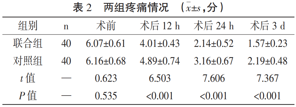 术前两组患者的 VAS 评分相比差异无统计学意义(P>0.05);联合组患者术后 12 h、24 h、3 d 的 VAS 评分比对照组低(P<0.05),见表 2。
