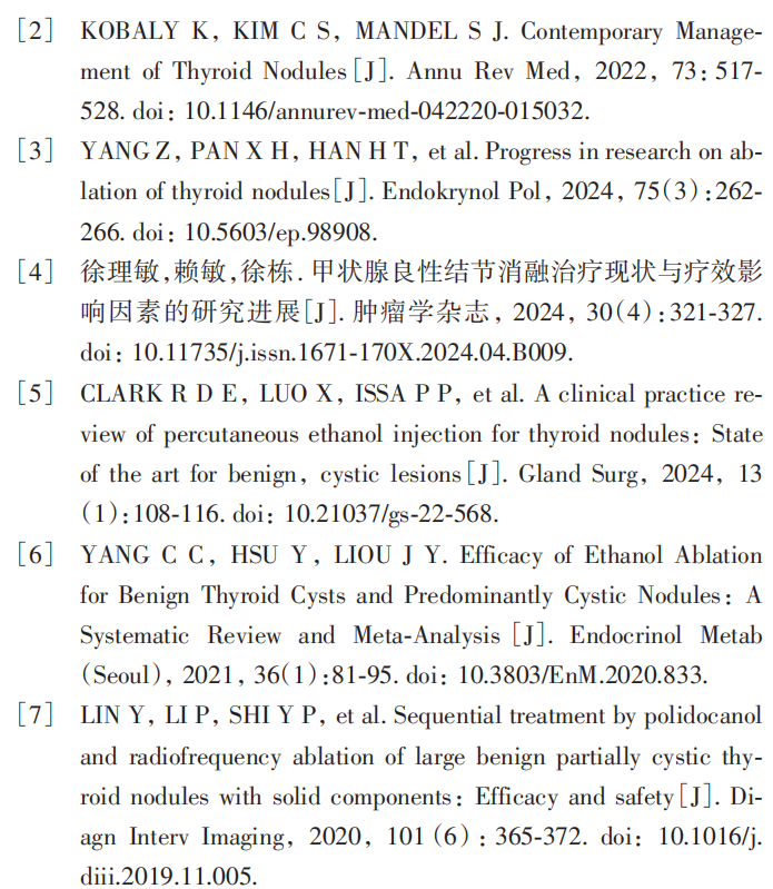 甲状腺结节在临床上十分常见,其中大部分为良性结节,一些体积较大的良性结节可能产生压迫症状进而影响患者呼吸、吞咽等功能,需要积极治疗,超声引导下的消融治疗具有微创、高效、安全的优点,目前被广泛应用于甲状腺结节的治疗。对于囊性或囊性为主的结节,目前化学消融(包括 PEI、PLI 注射等)、热消融(包括 RFA、MWA等)都是常用的消融治疗方法。