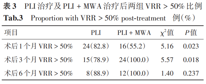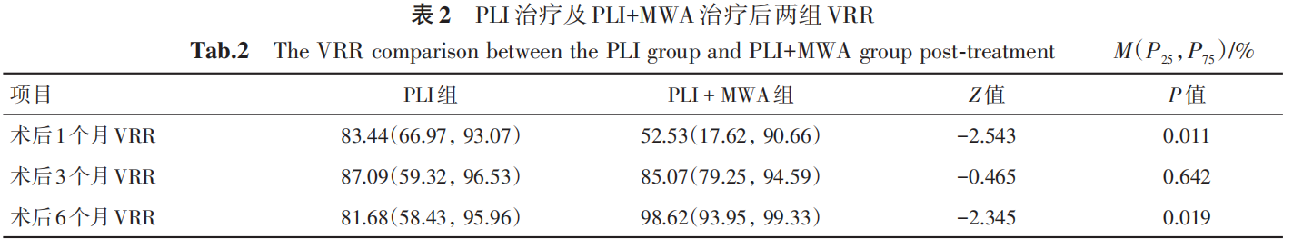 PLI 组在术后 1、3、6 个月的中位数VRR分别为83.44%、87.09%、81.68%,PLI + MWA 组在术后 1、3、6 个月的平均 VRR 分别为52.53%、85.07%、98.62%(表2),随着随访时间增加,PLI + MWA 组的 VRR 中位数逐渐增大,而 PLI组在术后 6 个月时的 VRR 中位数反而较前减少。采用Mann-Whitney U检验统计显示,在术后1个月PLI 组的 VRR 高于 PLI + MWA 组(Z = -2.543,P =0.011),而在术后 6 个月时 PLI + MWA 组的 VRR显著高于PLI组(Z = -2.345,P = 0.019)。