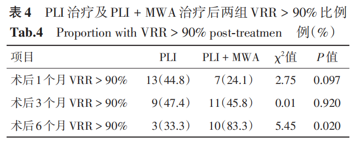 以VRR > 50%作为治疗有效的标准,则PLI治疗与PLI + MWA治疗在术后1、3、6个月的有效率分别为 82.8% vs. 55.2%(P = 0.023)、78.9% vs. 100.0%(P = 0.018)、88.9% vs. 100.0%(P = 0.237)(表3);以VRR > 90% 作为治愈的标准,则 PLI 治疗与 PLI +?MWA 治疗在术后 1、3、6 个月的治愈 率 分 别 为44.8% vs. 24.1%(P = 0.097)、47.4% vs. 45.8%(P =?0.920)、33.3% vs. 83.3%(P = 0.020)(表 4),表明单纯 PLI 治疗在术后 1 个月时的有效率高于 PLI +?MWA 治疗,在术后 3 个月时单纯 PLI 治疗的有效率不如 PLI + MWA 治疗高,在术后 6 个月时,两组治疗的有效率差异无统计学意义。而两组的治愈率在术后 1、3 个月时差异均无统计学意义,但术后 6 个月时 PLI + MWA 治疗的治愈率显著高于单纯PLI治疗。