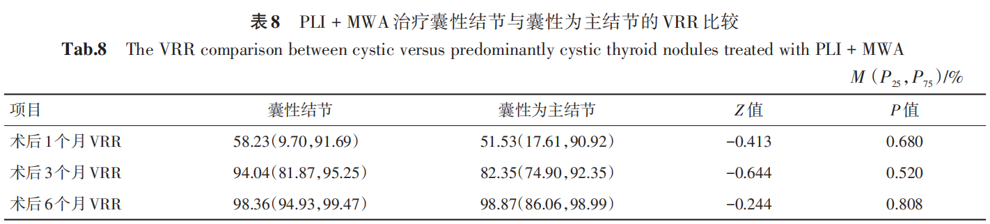 PLI 组共 23 个囊性结节,36 个囊性为主结节,治疗前,囊性结节与囊性为主结节的体积差异无统计学意义,PLI 治疗 1、3、6 个月时,两组结节的体积、及治疗后体积较基线减少量均差异均无统计学意义(P > 0.05)(表 5)。在治疗后 1、3、6 个月的 VRR 中位数分别 81.07% vs.90.20%、85.73% vs.88.55%、79.90% vs. 81.68%,采用Mann-Whitney U 检验统计显示,各随访时间点囊性结节与囊性为主结节的 VRR 差异均无统计学意义(P > 0.05)(表6)。PLI + MWA 组共 10 个囊性结节,21 个囊性为主结节,治疗1、3、6个月时,两组结节的体积、及治疗后体积较基线减少量均差异无统计学意义(P > 0.05)(表 7),在治疗后 1、3、6 个月的 VRR 中位数分别58.23% vs. 51.53%、94.04% vs. 82.35%、98.36% vs.98.87%,采用 Mann-Whitney U 检验统计显示,各随访时间点囊性结节与囊性为主结节的VRR差异均无统计学意义(P > 0.05)(表8),上述结果表明无论是单独采用PLI还是采用PLI + MWA治疗,囊性和囊性为主结节的治疗效果差异无统计学意义。
