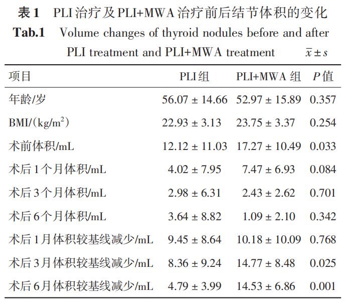 PLI 组治疗前结节的平均体积为(12.12 ± 11.03)mL,PLI + MWA 组治疗前结节的平均体积为(17.27 ± 10.49)mL。两组患者的年龄、BMI 差异均无统计学意义。术后随访,PLI 组在术后 1、3、6 个月的平均体积分别为 4.02、2.98、3.64 mL,PLI + MWA 组在术后 1、3、6 个 月 的 平 均 体 积 分 别 为 7.47、2.43、1.09 mL(表 1),无论是 PLI 治疗还是 PLI + MWA 治疗,甲状腺结节均较治疗前显著缩小,但单纯 PLI 治疗组在治疗 6 个月时的平均体积较治疗 3 个月时增大,而 PLI + MWA 治疗组结节平均体积随着时间增加而减少。与PLI 组相比,PLI + MWA 组的结节术前体积更大(P = 0.033),但治疗后 1、3、6 个月,两组结节的体积差异无统计学意义(P > 0.05),且 PLI + MWA 组治疗后结节体积较基线体积的减少量在治疗 3 个月[(15.77 ± 8.48)mL vs.(8.36 ±9.24)mL,P = 0.025]、6 个 月[(14.53 ± 6.86)mL?vs.(4.79 ± 3.99)mL,P = 0.001]时,均显著大于单纯 PLI 治疗组。