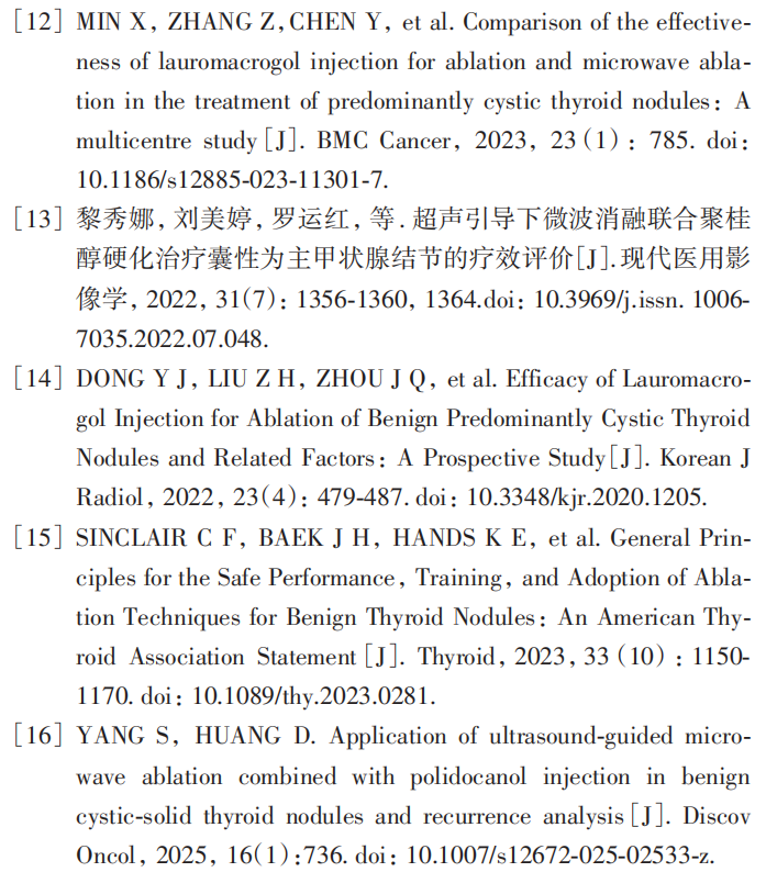 PLI 治疗是使用聚桂醇泡沫硬化剂注射入囊性或囊性为主的甲状腺结节内,使结节囊壁的上皮细胞发生无菌性炎症反应、坏死、囊腔粘连、闭合。PLI 对于囊性结节的治疗效果较好,但对于囊实性的结节治疗效果不理想[7]。MWA 的主要原理是通过微波辐射诱导电荷和水分子振动,分子间摩擦产生热量,使病灶内部短时间内产生高温,继而使组织凝固、脱水坏死。既往的研究[8-9]表明,MWA 治疗甲状腺微小乳头状癌、良性实性为主或囊实性结节的疗效和安全性较好,但对于纯囊性结节的治疗效果尚不明确,有研究[10]发现,纯囊性结节或囊性为主的结节,采用MWA 治疗导致结节囊内出血风险增加。国内 ZHANG 等[11]回顾分析了分别采用 PEI 治疗和 MWA 治疗的囊性或囊性为主的甲状腺结节,发现在治疗后 3 个月,PEI 组的中位 VRR 显著高于 MWA 组,但随访至12 个月,PEI 组与 MWA 组的中位 VRR 差异无统计学意义。MIN等[12]比较了PLI与MWA治疗囊性或囊实性结节的疗效,发现随访至 12 个月两种治疗方法的 VRR 差异无统计学意义。PLI 联合 MWA治疗囊性或囊性为主甲状腺结节的相关文献还较少,因此,本研究旨在探讨采用 PLI 联合 MWA 治疗囊性或囊性为主的良性甲状腺结节,是否能获得较单纯PLI治疗更好的治疗效果。
