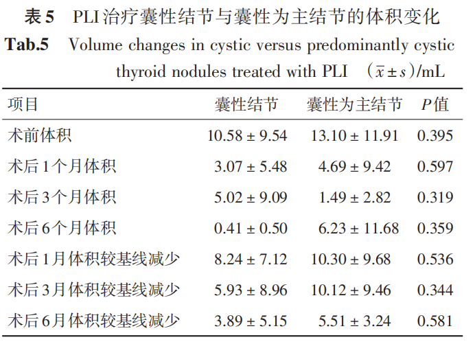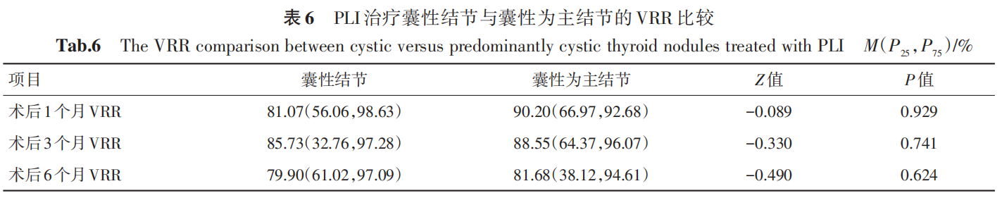 本研究表明,对于囊性或囊性为主的良性甲状腺结节,在术后 1 个月时,PLI 治疗较 PLI 联合MWA 治疗能更有效缩小结节体积,而在术后 6 个月时,PLI 联合 MWA 治疗的结节 VRR 优于单纯PLI治疗。因此,从长期疗效考虑,我们认为PLI联合 MWA 治疗可能是治疗囊性或囊性为主的良性甲状腺结节更好的方案,但还需要更大样本量、更长随访时间及全面考虑手术并发症、患者满意度、美容评分等方面的前瞻性研究来进一步证实。