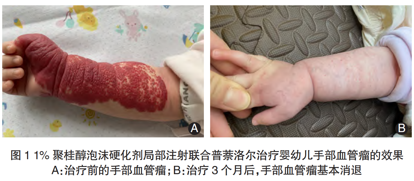 使用 1% 聚桂醇泡沫硬化剂局部注射联合普萘洛尔治疗混合型婴幼儿手部血管瘤的效果,见图1。