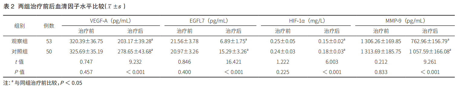 治疗后, 观察组与对照组的血清VEGF-A、EGFL7、HIF-1α、MMP-9 水平均较治疗前降低,且观察组的下降幅度均显著大于对照组(P < 0.05)。详见表 2。