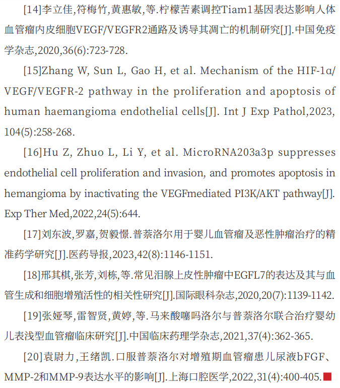 普萘洛尔是一种非选择性肾上腺素能 β 受体阻滞剂,是婴儿血管瘤的一线治疗药物,其作用机制主要是通过抑制血管内皮细胞增殖、诱导血管收缩及促进细胞凋亡发挥作用 [9]。此外,普萘洛尔能够对人脐静脉内皮细胞的增殖、迁移及成管潜能产生抑制效果,同时可诱导该细胞的凋亡,并下调性别决定区 Y框 18(SOX18)、基质金属蛋白酶 -7(MMP-7)及 VEGF-A的表达水平 [10]。然而,单独使用普萘洛尔对混合型血管瘤的治疗效果有限。