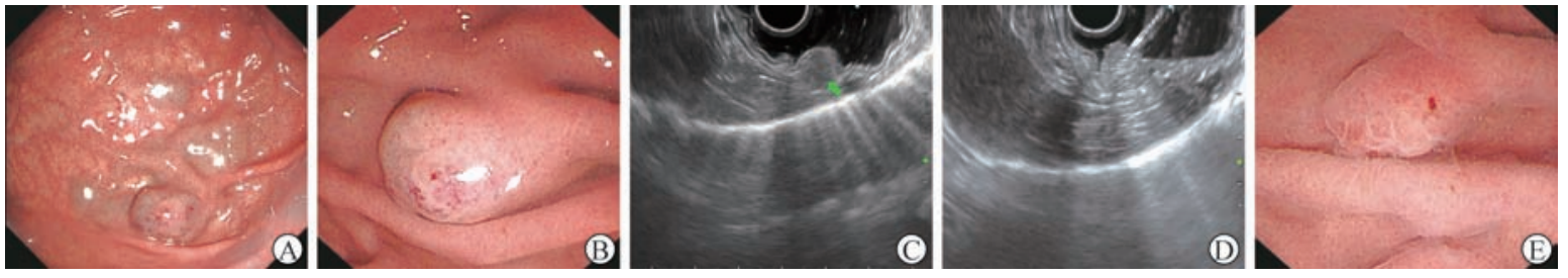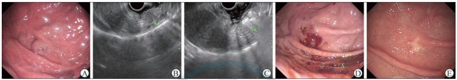入院后行血常规、粪便常规、粪便隐血试验、肝功能、肿瘤标志物等检查,均未见明显异常。2022 年6 月21 日肝脏CT增强检查提示,胃底部见一直径约12mm的结节影,动脉期未见明显强化,门静脉期明显不均匀强化,考虑良性病变(图1)。2022年6月23日内镜检查提示胃底大弯侧黏膜下蓝紫色血管样隆起簇和明显结节状隆起,较大隆起结节直径约10 mm,考虑为胃底血管瘤(图2A、2B);换用纵轴超声内镜进镜,扫描隆起结节状病灶处见蜂窝状低回声团块,起源于黏膜下层(图2C),测量大小为9. 1 mm × 11 mm,彩色多普勒超声血流图像显示少量的血流信号;遂超声内镜引导选用22G注射针(南微医学科技股份有限公司)刺入病灶处,并向内注射聚桂醇约10 mL(图2D);注射后再次用超声内镜扫描发现术后病灶处腔内高回声充填,黏膜下隆起明显塌陷(图2E)。术后嘱患者常规禁食12h,予以补液、护胃、头孢呋辛预防性抗感染等对症支持治疗,术后未出现发热、腹胀、腹痛、呕血、黑便等症状,术后第2 天顺利出院。2022 年11月3日患者入院复查,内镜下仍见胃底大弯侧黏膜下血管样结节隆起,较上一次内镜检查范围明显缩小(图3A),遂再次行超声内镜引导聚桂醇消融术(图3B、3C),术后血管瘤腔内呈高回声充填,病灶较前注射前明显塌陷(图3D)。术后住院观察期间患者未出现发热、呕血、黑便、腹胀、腹痛等情况,术后第2天顺利出院。3个月后(2023年2月9日)患者再次复查,内镜下见胃底大弯侧黏膜瘢痕样改变,注水后用12 MHz超声微探头扫描见原病灶处胃壁层次结构正常(图3E)。目前患者门诊定期随访中,至截稿一般情况良好。