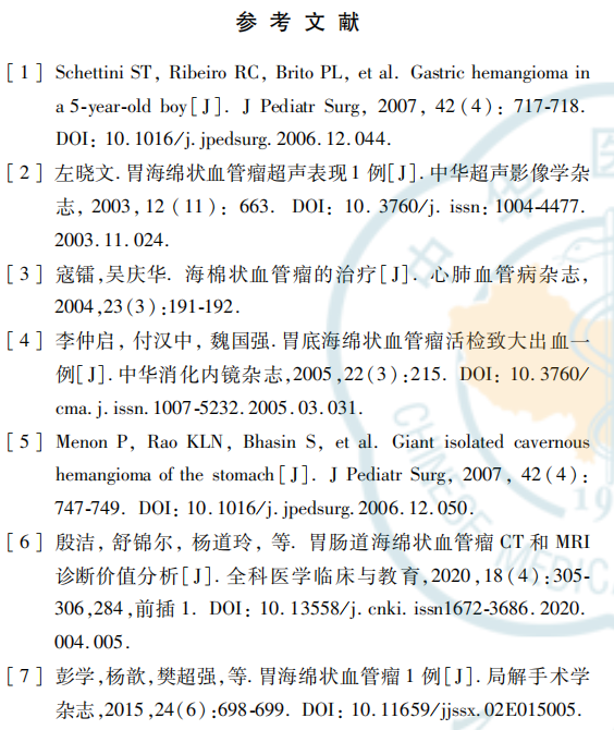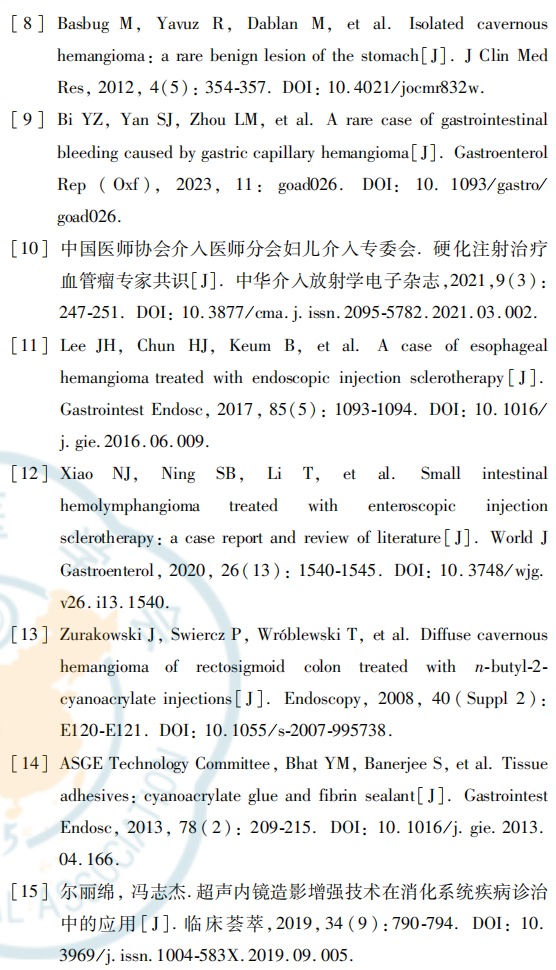 对于病灶范围较大或出血严重的胃血管瘤患者建议行外科手术治疗,目前外科手术的标准治疗方法包括楔形切除、全胃或胃部分切除[7]。血管瘤的非手术治疗方案包括内镜下切除、硬化剂注射、冷冻疗法、氩气刀烧灼等,但部分患者治疗效果欠佳,且易复发[8 9]。聚桂醇化学名称为聚氧乙烯月桂醇醚,是目前临床运用最广泛的一种硬化剂,在血管瘤治疗中具有疗效确切、安全性好等临床优势。硬化剂注入血管瘤体后使血管内膜产生无菌性炎症,导致纤维组织增生、管腔闭塞,引起靶血管损伤、血栓纤维化,使血管瘤组织逐渐吸收、缩小至消失[10]。目前内镜下硬化剂注射成功治疗食管、胃、小肠、结直肠血管瘤或血管畸形均有病例报告,但远期疗效仍有待随访验证[11-13]。组织胶为一种氰基丙酸酯类黏合剂,在血液、组织液中的阴离子作用下,氰基丙烯酸酯分子在血管内快速聚合固化,从而封堵血管,阻断血液流动,达到栓塞血管的目的[14]。由于组织胶遇血迅速凝固的特性使其在蜂窝状的血管瘤组织内难以持续渗透,影响后续治疗,可能导致血管瘤治疗不彻底,因此并未对本病例采用组织胶作为注射剂栓塞血管瘤,未来可尝试探索组织胶在急性胃血管瘤破裂出血等病例中的运用。