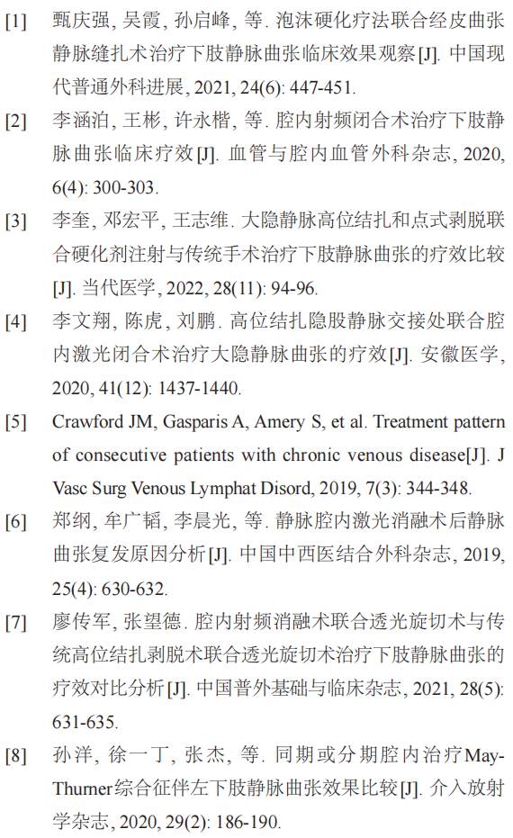 下肢静脉曲张是临床上一种常见的血管疾病[1-2],主要因下肢静脉压异常升高,导致静脉壁受累后发生扩张、膨出或迂曲等引发的病变类型[3-5]。患者通常可见患肢肿胀,或伴有疼痛,静脉突出、纠集、迂曲,病变静脉处皮肤可见瘙痒、色素沉着,甚至形成溃疡[6-8]。轻度下肢静脉曲张主要采用保守治疗,以延缓或推迟病情进展为主要目标。中重度下肢静脉曲张则主要采用手术治疗,大隐静脉高位结扎剥脱术为下肢静脉曲张治疗的常规经典术式,但小腿段的曲张静脉选择手术进行点式剥脱手术创伤范围较大,术后应激反应较为明显,恢复进程较长,易出现多种并发症而影响手术疗效。泡沫硬化剂注射为新型微创血管内注射治疗方法,其对于下肢浅表静脉及静脉分支曲张具有理想疗效,但单纯应用泡沫硬化剂治疗下肢静脉主干曲张治疗中易发生硬化不完全、血栓性浅静脉炎等并发症。因此,本研究在常规高位结扎剥脱术中联合应用泡沫硬化剂治疗,以缩小常规高位结扎剥脱术联合点式剥脱术的创伤范围,避免泡沫硬化不完全,从而达到最佳治疗效果的目标,现报道如下。