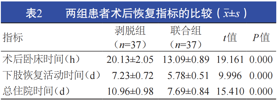 联合组患者术后卧床时间、下肢恢复活动时间、总住院时间均短于剥脱组患者,差异均有统计学意义(P<0.05)。(表2)