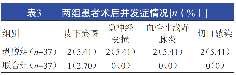 联合组患者术后并发症总发生率为2.70%(1/37),低于剥脱组患者的21.74%(8/37),差异有统计学意义(χ2=4.554,P=0.033)。(表3)