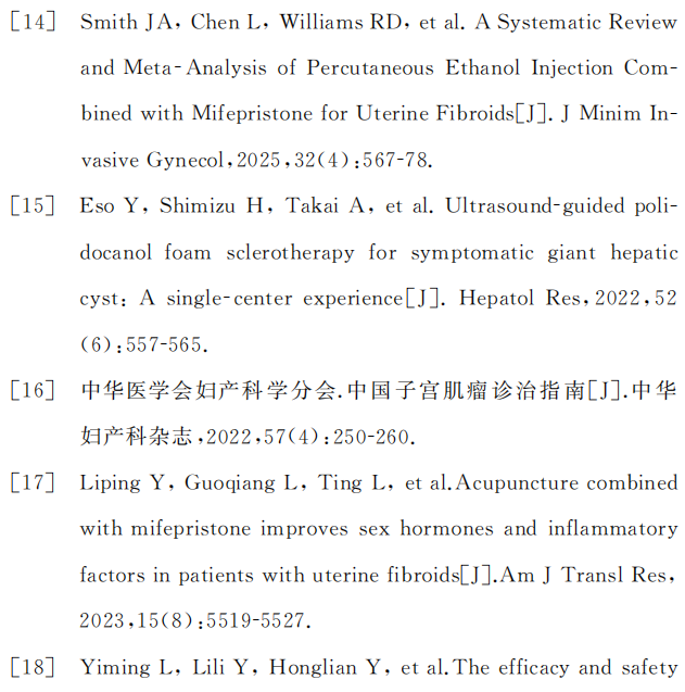 本研究也存在不足,如超声引导下聚桂醇硬化治疗需要专业的操作技术和设备,如操作不当,可能会导致硬化剂注入错误部位,损伤周围组织,如膀胱、直肠等,导致出血、穿孔等风险.另外,目前的研究样本量相对较小,如随访中位数为20个月,与对照组比,观察组的 UF复发例数较少,但两组的 UF复发率未显示出统计学差异,提示小样本研究可能存在选择偏差,一定程度限制研究结果的外推性.下一步研究有必要增加样本量并延长随访时间,有助于更好地了解肌瘤的复发率、子宫功能的恢复情况以及潜在的不良反应。
