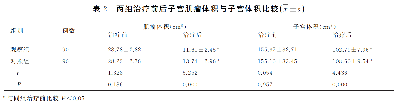 子宫肌瘤体积、子宫体积,治疗前两组无差异(P>0.05);治疗后,两组均有不同程度降低,且观察组均低于对照组(均P<0.05)。见表2。
