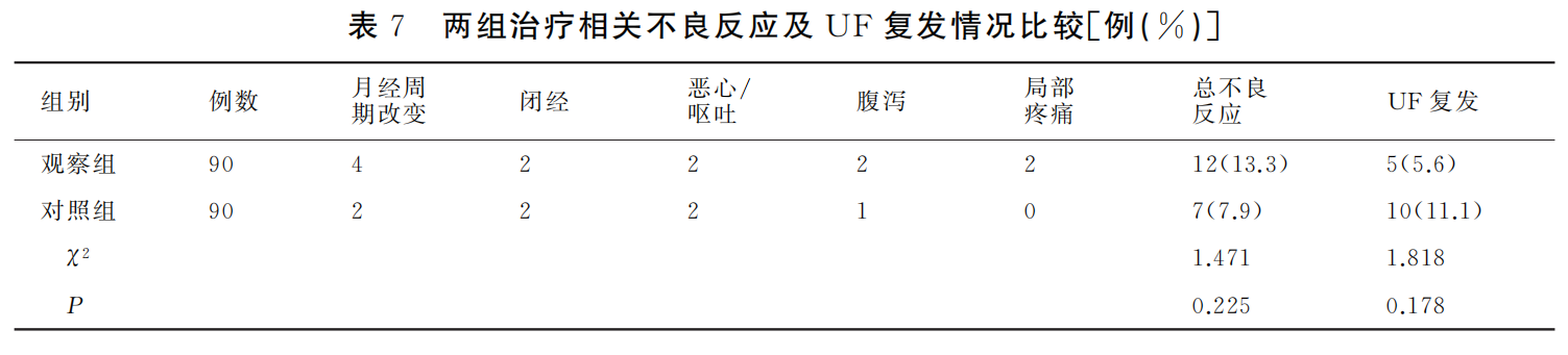 治疗期间两组均不同程度的月经周期改变、闭经、恶心/呕吐、腹泻,观察组出现局部疼痛,总不良反应发生率两组无差异(P>0.05).两组均接受随访,随访时间7~31个月,随访中位数为20个月,与对照组比,观察组 UF复发例数较少,但两组的 UF复发率无差异(P>0.05).见表7。