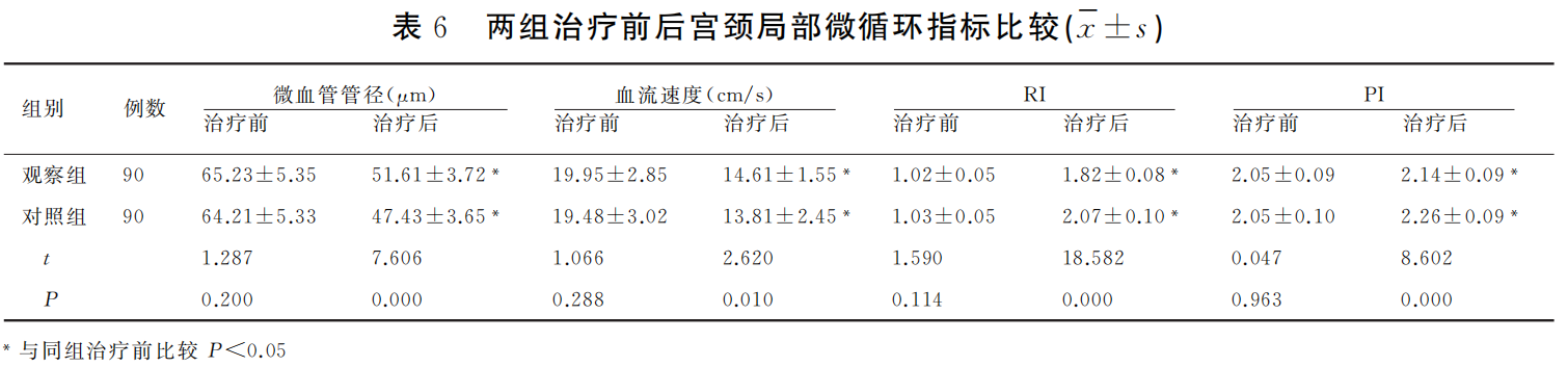 治疗前,两组宫颈微血管管径、血流速度、RI、PI比较无差异(P>0.05);治疗后,两组微血管管径、血流速度均不同程度降低,RI、PI均不同程度增高,且观察组各参数指标变化幅度大于对照组(均P<0.05).见表6。