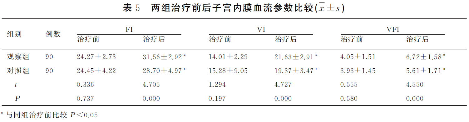 子宫内膜血流参数 FI、VI、VFI,治疗前两组无差异(P>0.05);治疗后,两组各参数均有不同程度升高,且观察组升高幅度大于对照组(均P<0.05).见表5。