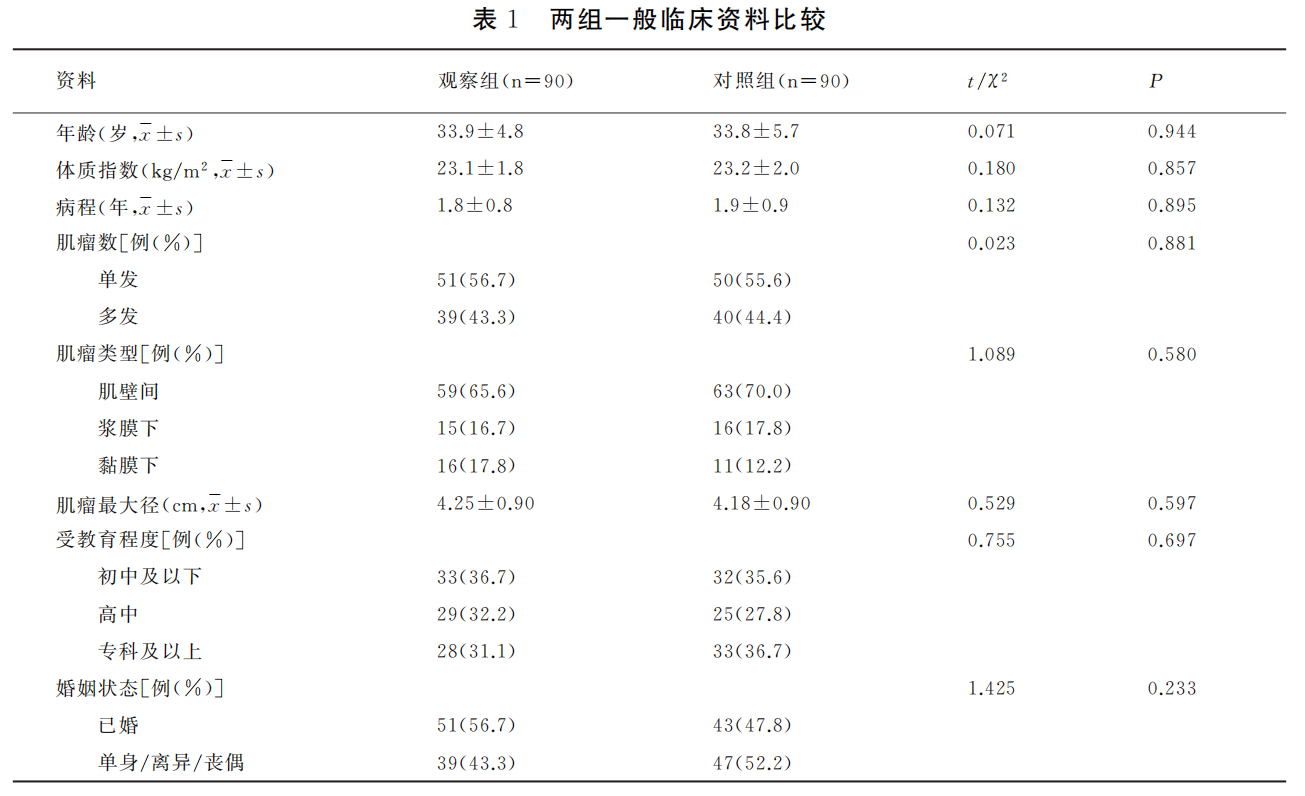 两组年龄、体质指数、病程、肌瘤最大径、肌瘤单/多发、UF 类型、受教育程度和婚姻状态等临床资料对比无差异(P>0.05).见表1。