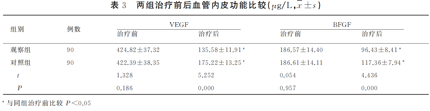 血清 VEGF、BFGF 水 平,治 疗前两组无差异(P>0.05);治疗后,两组均有不同程度降低,且观察组水平低于对照组(均P<0.05)。见表3。
