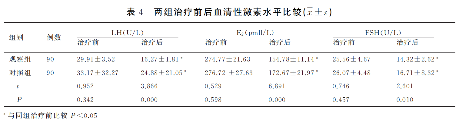 血清 LH、E2、FSH 水平,治疗前两组无差异(P>0.05);治疗后,两组均不同程度降低,且观察组低于对照组(均P<0.05)。见表4。