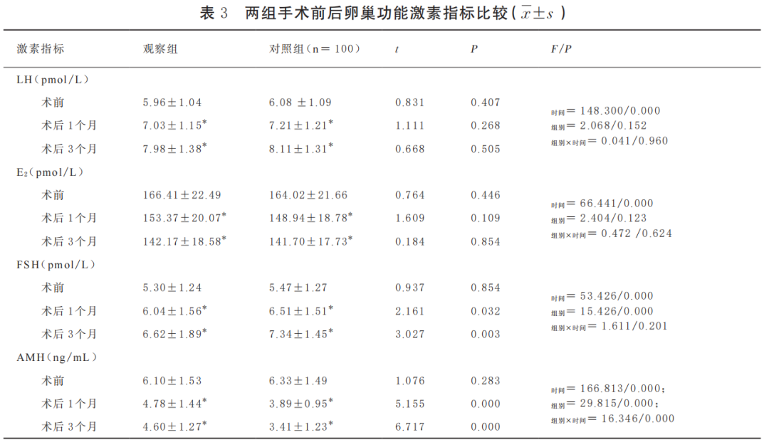 与术前比,两组术后血清 LH、FSH 水平均有不同程度升高,E2、AMH 水平均有不同程度降低(P < 0.05),与对照组比,观察组术后 1 个、3 个月的 FSH 均降低,AMH 均升高(P < 0.05),但观察组LH、E2、FSH、AMH 指标变化相对较小。见表 3。