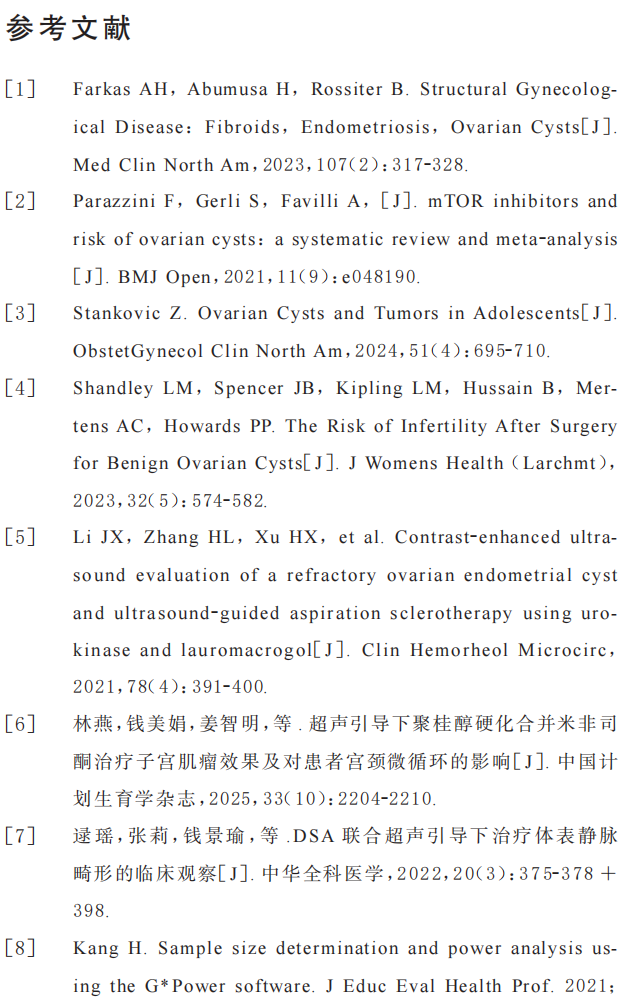 综上,超声引导下聚桂醇联合地塞米松硬化治疗卵巢囊肿可提升疗效,保护卵巢功能,为有生育需求的卵巢囊肿患者提供了更安全、有效的微创治疗选择。