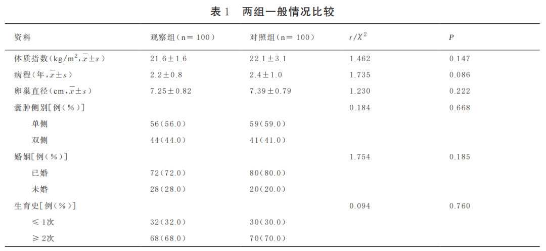 两组体质指数、病程、卵巢直径、囊肿侧别、婚姻状况和生育史等一般情况具有可比性(P >0.05)。见表 1。